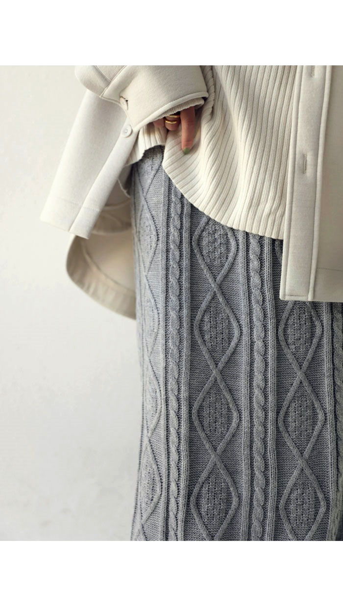 そのうえ、ケーブルニットなんて暖かくてデザインが可愛いし、大人女子度がさらにアップ!ウエストはゴム仕立てで穿きやすく、タイトめなラインで綺麗なシルエットが叶い、大人っぽい印象を与え必ず使える一枚に♪