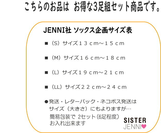 ■価格・3足セット(本体1000円)+(税) ■JENNIソックスサイズ表■ ■(S)サイズ13cm〜15cm ■(M)サイズ16cm〜18cm ■(L)サイズ19cm〜21cm ■(LL)サイズ22cm〜24cm