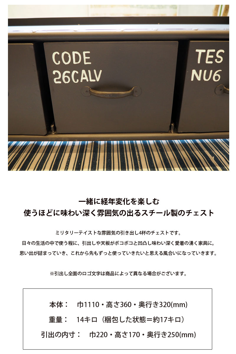ienowa イエノワ チェスト 中 201200267 横型 横 4杯引出 インダストリアル 男前インテリア ミリタリー ブルックリン スチールチェスト スチール 棚 収納 引き出し アンティーク調 アメリカン アメカジ 家具 ブラック 黒 メタルチェスト 代引不可