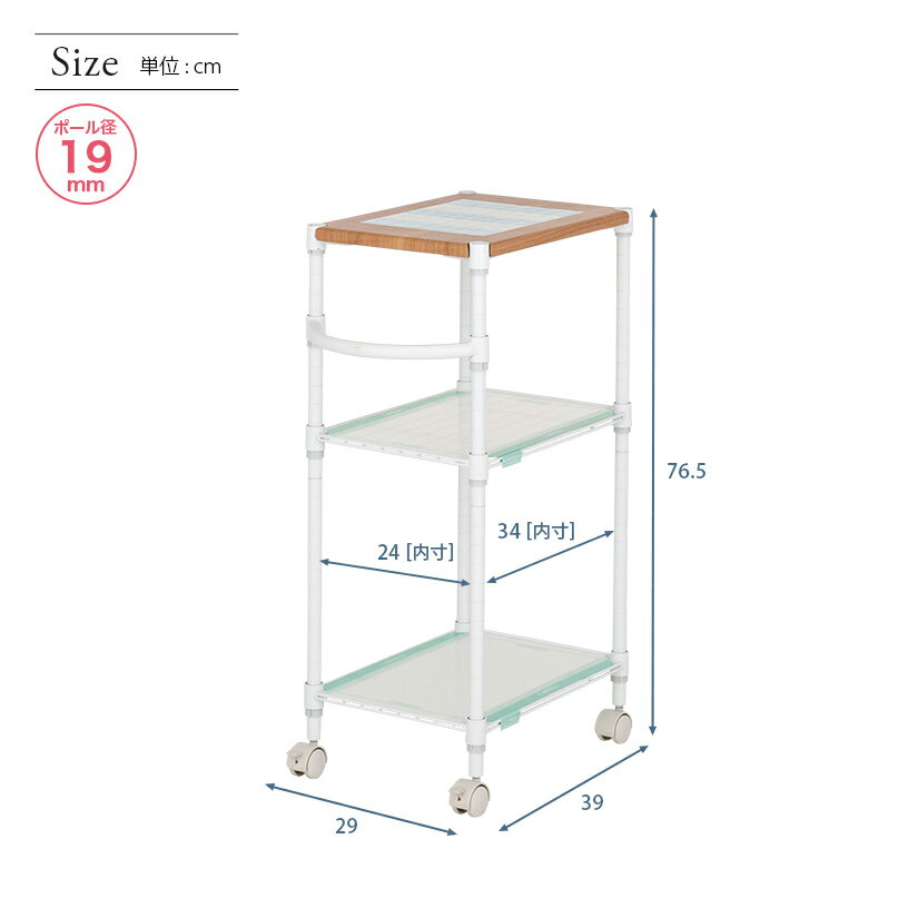 商品仕様 商品シリーズ ルミナス ホワイト タイルトップワゴン 3段 幅40 WH キャスター付き 外形寸法 幅39.5×奥行29.5×高さ76.5cm(ハンドルを含めた幅:47cm) シェルフ内寸 幅33×奥行23cm ポール分割サイズ [上部]34.2cm [下部]35.9cm 備考 ルミナスホワイト専用パーツの単品での取り扱いはございません。