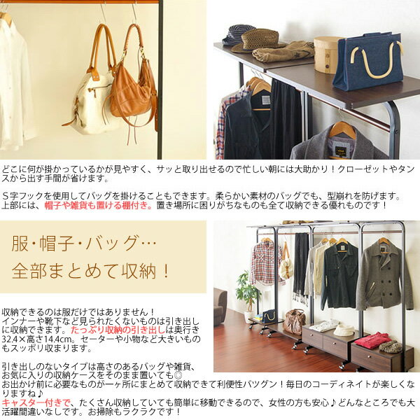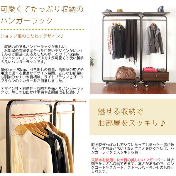 ■商品仕様 カラー LBR/ライトブラウン DBR/ダークブラウン サイズ(cm) W90×D40×H164.5 仕 様 ◇材質スチール(エポキシ樹脂粉体塗装) プリント紙化粧繊維板 天然木(ラッカー塗装) ◇耐荷重 ハンガーバー:15kg/上棚:10kg ◇キャスター付き ※組立式(約20分) 送 料 送料無料 ※北海道、沖縄、離島は別途料金がかかります。